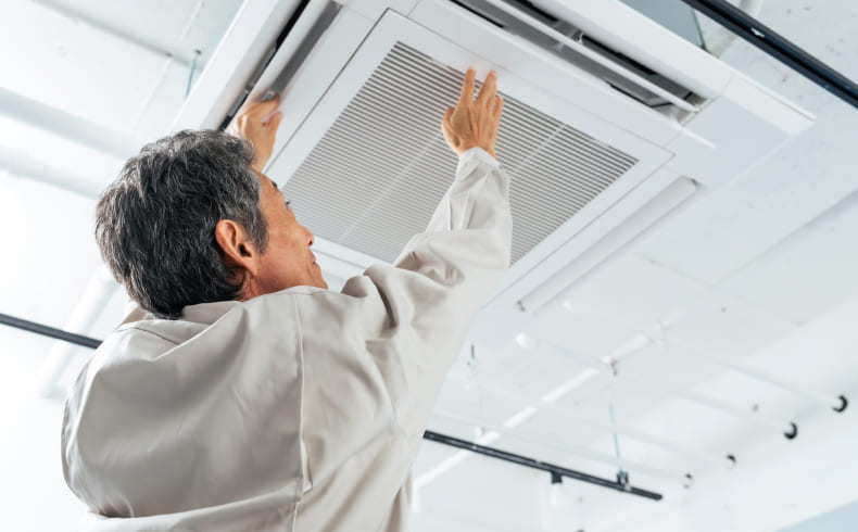 天吊形の業務用エアコンは、天井埋め込み形に比べて設置場所に制限が少なく、広い空間にも適しているため、店舗やオフィス、会議室などでよく使われている。また、天井に吊り下げられるため、壁や床を取らず、空間の有効活用ができる点も魅力的!メンテナンスもしやすく、フィルターの清掃や交換も比較的簡単に行えるため、衛生的な空気環境を保ちやすいです!